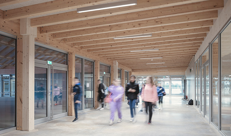 Douglasie war das Holz der Wahl für den Oberbau. Überhaupt stellten Schadstofffreiheit und Umweltwirkung der Materialien wichtige Faktoren bei der Auswahl dar. Lokale Materialien kamen vorzugsweise zum Einsatz, um den CO2-Abdruck während der Errichtung möglichst gering zu halten. Das im November 2023 fertiggestellte Collège ist ein Plus-Energie-Haus: Die Solaranlage erzeugt Strom auf einer Fläche über 1.200 Quadratmeter und ermöglicht den nachhaltigen Energie-Überschuss. Erdwärmepumpen liefern Heizwärme, können aber auch zur Kühlung im Sommer eingesetzt werden.